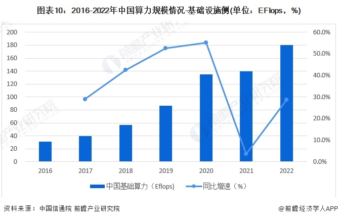 随着全国一体化算力网络国家枢纽节点的部署和“东数西算”工程的推进,我国算力基础设施建设和应用保持快速发展。。2017-2022年,中国算力规模呈现逐年上升的状态。根据中国通信院披露的信息,2022年,我国算力规模为180 EFlops,同比增长28.6%,位居全球第二,算力总规模近五年年均增速超过了25%。